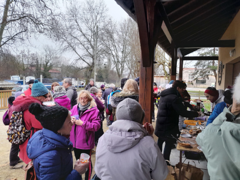 Après l'effort le réconfort ! Pour cette dernière randonnée de l'année et pour joindre l'utile à l'agréable, une soixantaine de marcheurs se sont retrouvés à l'issue de la rando au local de l'école de pêche, au port de Louhans. Ici les animateurs et accompagnants sportifs offraient le vin chaud agrémenté de pâtisseries confectionnées par les bénévoles.